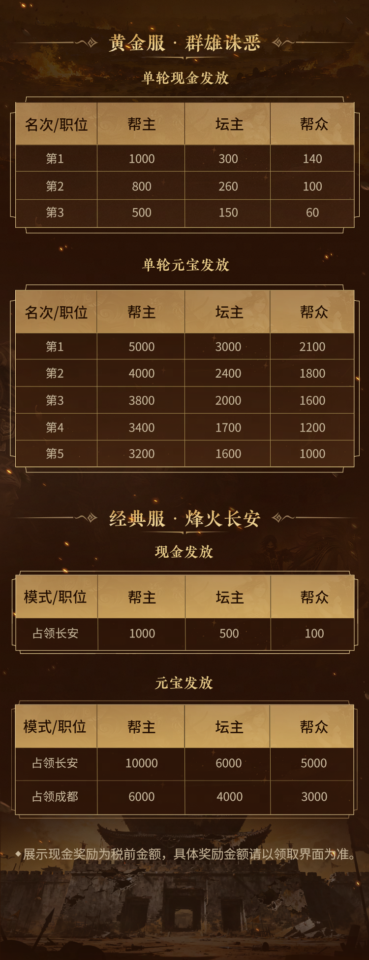 黄金服“帮会大乱斗”再度开启,经典服也将迎来烽火长安加码奖励!在“烽火长安”玩法中占领长安,帮会成员将共同瓜分万元现金大奖,同时,占领长安及成都的帮会也将共同瓜分60万元宝!少侠们可以查看下方长图,了解具体奖励。